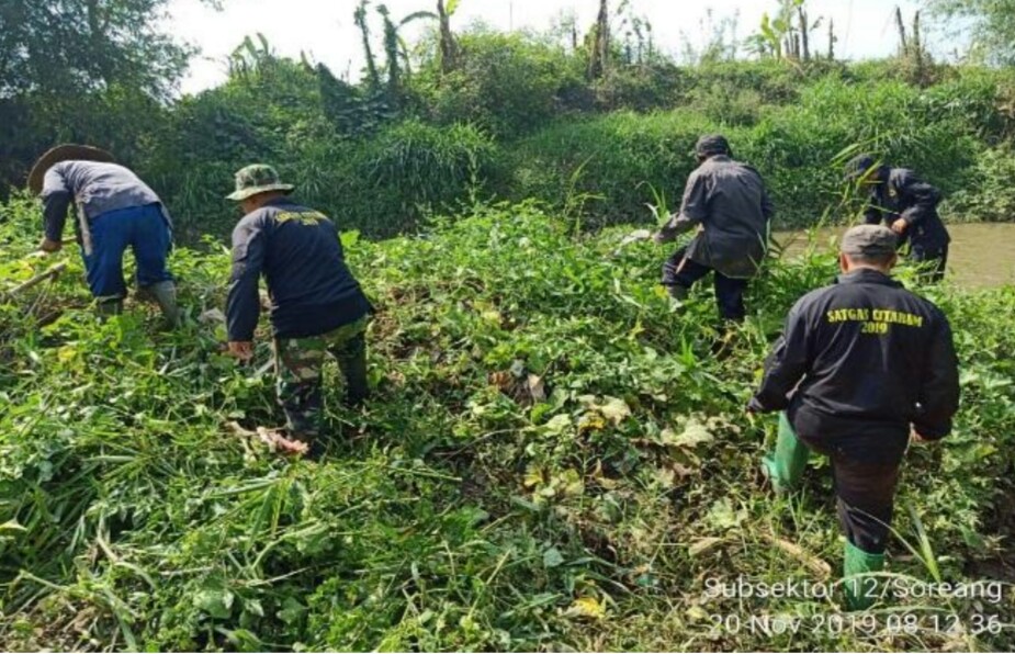 “mulai pada pukul 08.00 wib selain membersihkan sampah hari ini kami melaksanakan giat pembersihan rumput di aliran sungai atau anak sungai ciwidey di kampung Mandala Rt.02 Rw.05 desa Sukajadi kecamatan Soreang kabupaten Bandung dan dengan hasil pembersihan rumput pada aliran sungai sepanjang 130 M2”, ujar dansubsektor 12