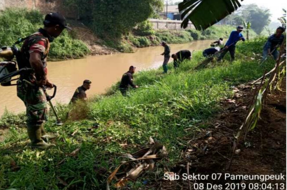mulai pada Pukul 07.45 wib anggota TNI Satgas Citarum bersama pelopor kebersihan melaksanakan pembersihan dan pengangkatan sampah serta pembabadan rumput di bantaran sungai Cisangkuy kampung Rancaengang desa Rancamulya kecamatan pameungpeuk kabupaten Bandung.