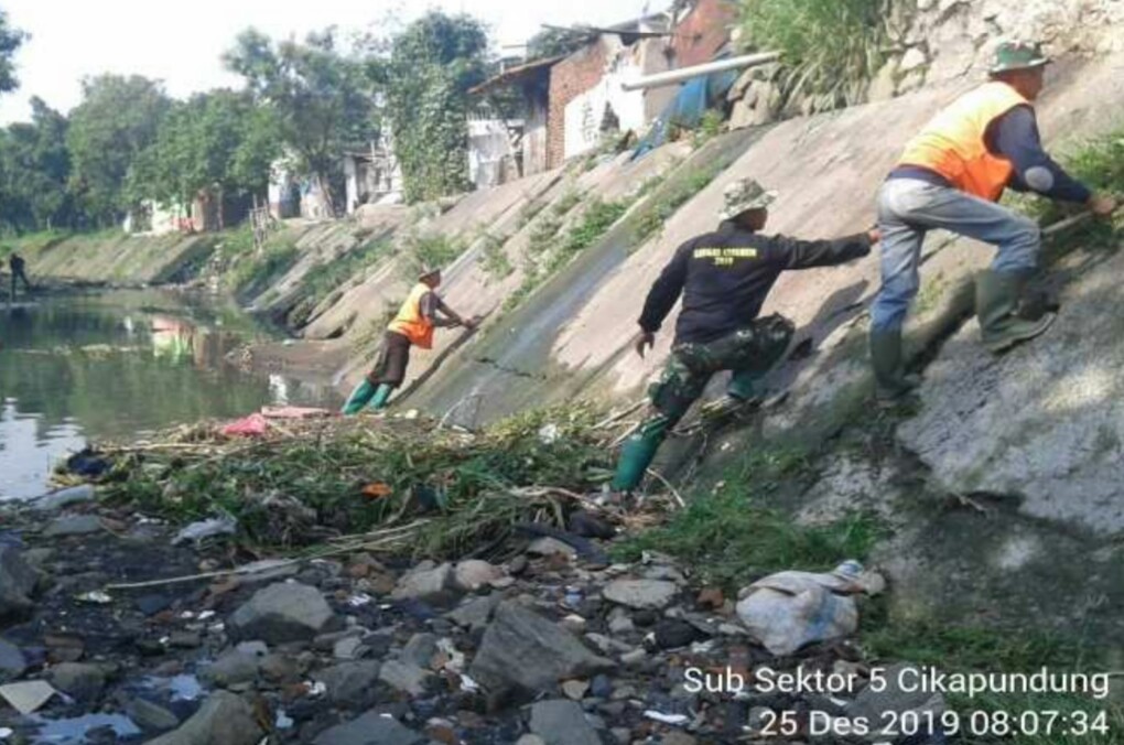 EDUPUBLIK, Kab Bandung – Walaupun di hari libur, dalam proses menyukseskan program citarum harum, agenda giat Satgas Citarum Sektor 21 subsektor 5 Cikapundung hari ini membersihkan sungai dari sampah dan rumput liar, patroli dan komsos yang di laksanakan oleh Subsektor 5 prajurit TNI satgas Citarum dan pelopor kebersihan dari warga masyarakat, Rabu (24/12/2019).