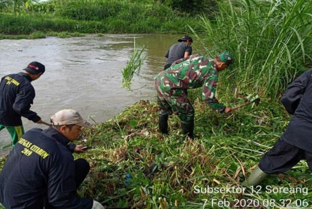 EDUPUBLIK, Kab Bandung – Giat Karya bakti (karbak) bebersih sungai dari rumput liar dan sampah dalam program Citarum harum maka aktifitas Satgas Citarum Harum Sektor 21 subsektor 12 Soreang bersama warga masyarakat sekitar, setiap harinya tetap melaksanakan giat patroli dan bersih-bersih sungai di wilayahnya yaitu kecamatan Soreang, Jumat (7/2/2020).