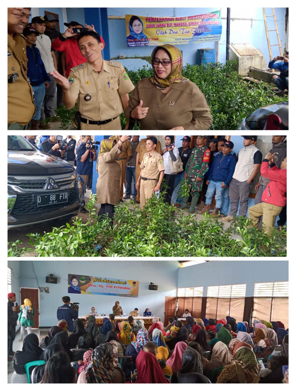 Kedatangannya tiba lokasi reses Tia fitrian langsung secara simbolis memberikan bantuan bibit hortikultura kepada kepala desa Tarumajaya yaitu jeruk, jambu biji, sirsak dan nangka