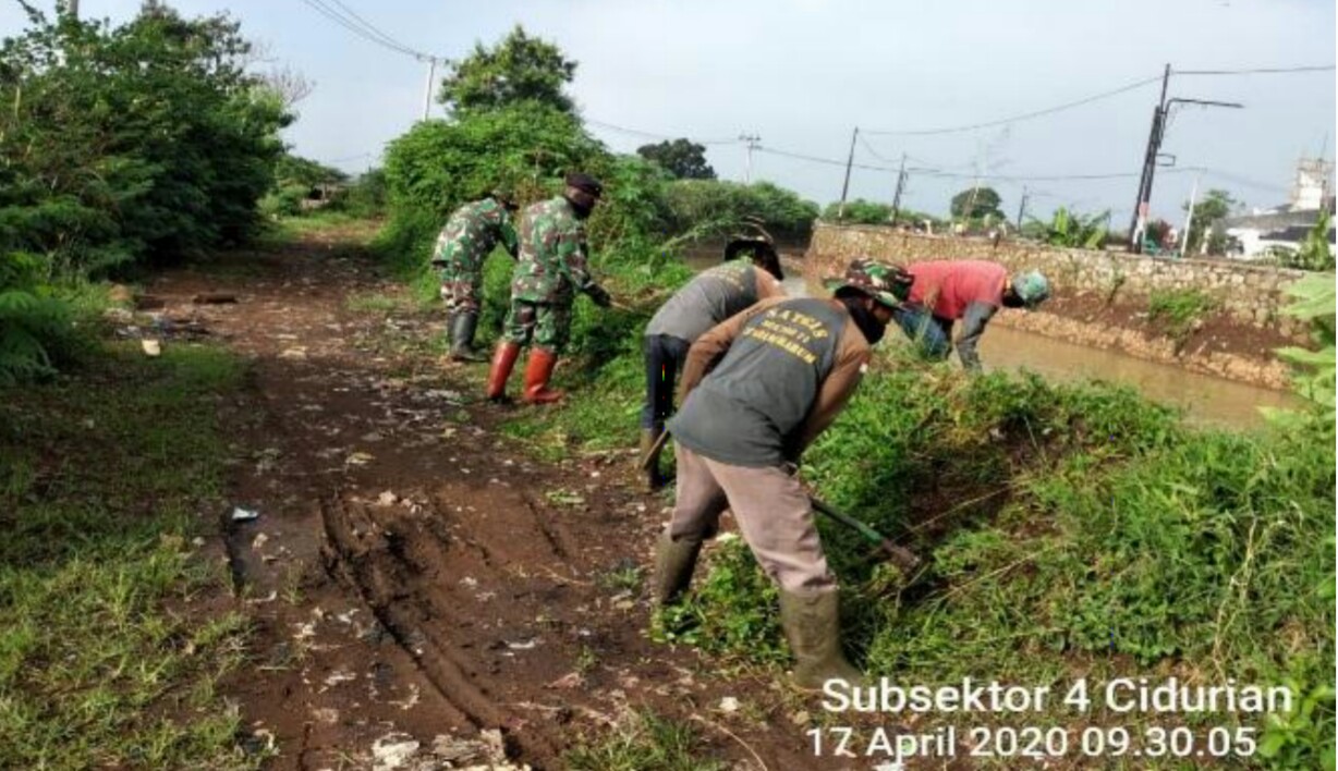 EDUPUBLIK, Kab Bandung – Meskipun menjelang situasi PSBB (Pembatasan Sosial Bersekala Besar) dalam mengatasi wabah virus Covid 19 di wilayah Bandung Raya, tetap dalam tugas pokok giat Satgas Citarum Harum Sektor 21 Subsektor 4 Cidurian bersama pelopor kebersihan dari warga melaksanakan giat karya bakti (Karbak ) babad rumput dan bersihkan sampah di sepanjang aliran sungai Cidurian Kabupaten Bandung, Jumat (17/4/2020).