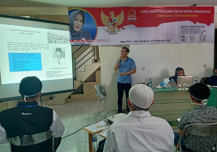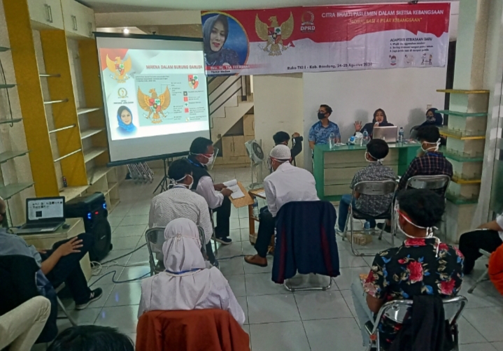 EDUPUBLIK, Kab Bandung – Anggota Dewan Perwakilan Rakyat Daerah (DPRD) Provinsi Jawa Barat (Jabar) Tia Fitriani dengan protokol social distancing menggelar program citra Bhakti/parlemen dalam sketsa kebangsaan yaitu sosialisasi empat pilar kebangsaan bersama masyarakat dan kader-kader bangsa di Kabupaten Bandung, bertempat ruko dijalan Taman Kopo indah 1 blok B Kav H desa Margahayu tengah kec margahayu Selasa (25/8/2020).