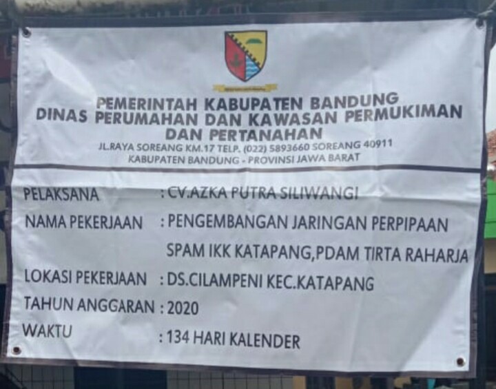 EDUPUBLIK, Kab Bandung – Dengan adanya pekerjaan proyek dari Dinas Perumahan Permukiman dan Pertanahan (Disperkimtan) kabupaten Bandung di wilayah desa Cilampeni kecamatan Katapang, yaitu pengembangan jaringan perpipaan spam, IKK Katapang, PDAM Tirta Raharja, Tahun Anggaran 2020, yang dikerjakan oleh Cv Azka Putra Siliwangi. Di duga tidak jelas anggarannya, karena tidak tercantum nilai pagu serta jumlah nilai rupiahnya .
