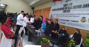 EDUPUBLIK, Bandung – Pasangan cagub cawagub terakhir yang mendaftar ke KPUD Jabar adalah Tubagus Hasanudin-Anton Charliyan untuk menyerahkan berkas pendaftaran sebagai pasangan calon peserta Pilgub Jawa Barat 2018, Pasangan yang diusung PDIP (Partai Demokrasi Indonesia Perjuangan) ini tiba di KPUD Jabar Jl. Garut Nomor. 11 Bandung. pukul 15.50 WIB, Rabu (10/1/2018). PDIP, satu-satunya partai yang memiliki 20 kursi di Jabar, ...